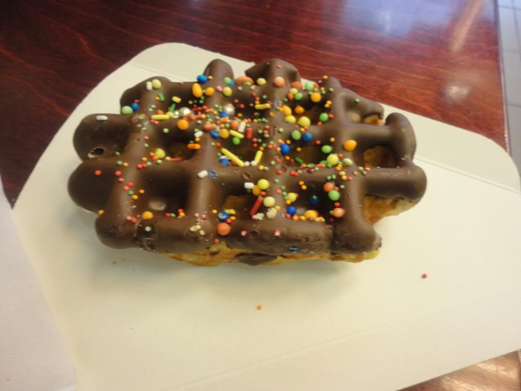 On Wednesday morning, I ate a really good waffle covered with chocolate icing and sprinkles.